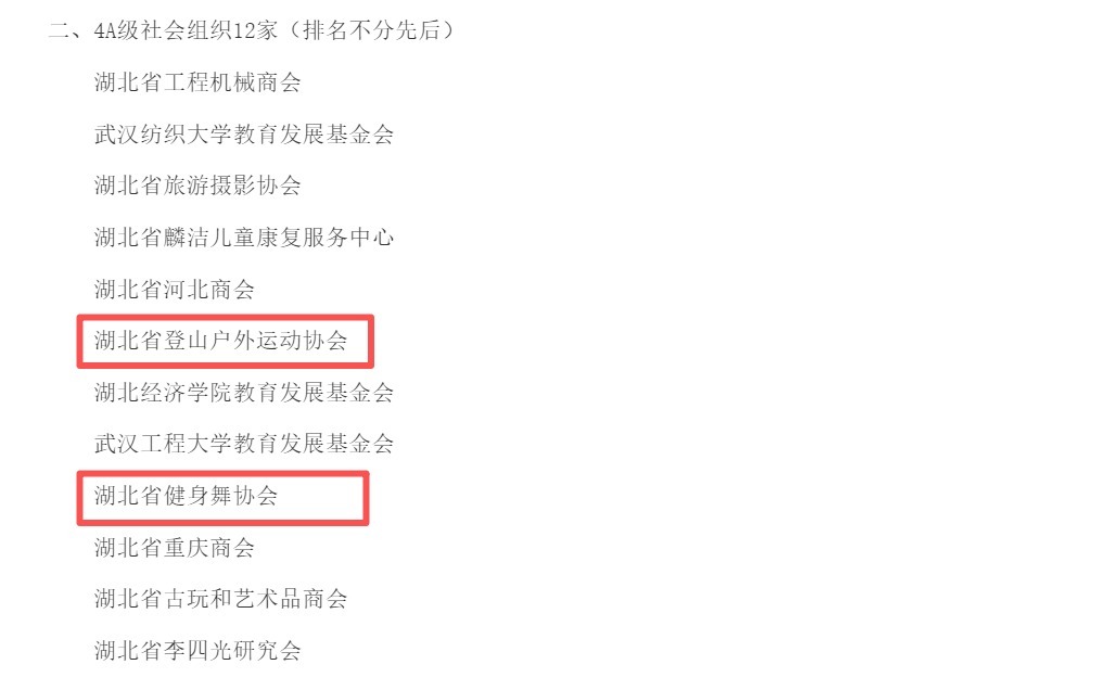 湖北日报讯(记者童军鹏、通讯员罗星棋)近日,根据《社会组织评估管理办法》及省民政厅相关工作部署,经严格审核、实地初评、集中评审与社会公示,2025年度全省性社会组织评估结果正式公布。在本次评估中,全省共41家社会组织获评3A以上等级。其中,湖北省登山户外运动协会、湖北省健身舞协会荣膺“4A级社会组织”称号;湖北省柔力球运动协会、湖北省门球协会荣膺“3A级社会组织”称号,评估等级有效期均为五年。