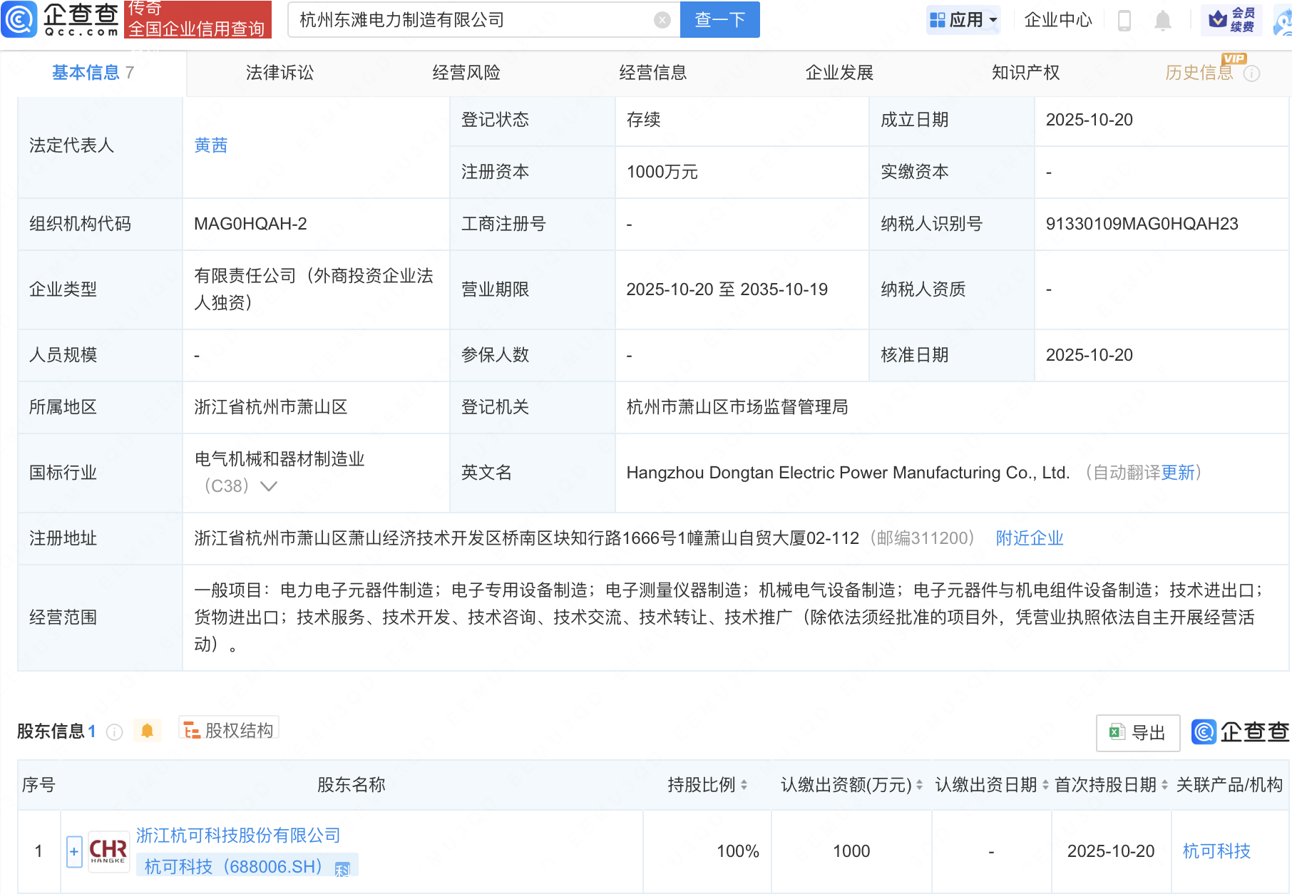 近日,杭州东滩电力制造有限公司成立,注册资本1000万元,经营范围包含:电力电子元器件制造;电子专用设备制造;电子测量仪器制造等。企查查股权穿透显示,该公司由杭可科技(688006)全资持股。