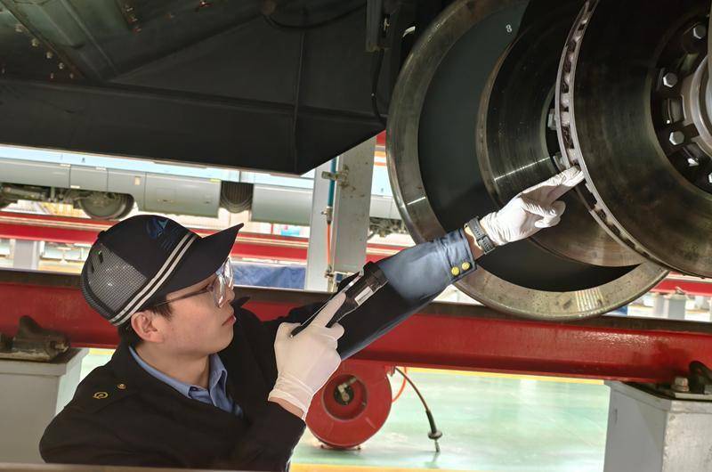 人民网银川12月21日电 (记者梁宏鑫)包银高铁即将全线贯通,兰州车辆段银川动车所地勤机械师团队以“毫米级”检修筑牢动车组安全屏障。库内动车组整齐排开,机械师们严格执行“必看、必指、必呼、必画、必触”作业标准,展开“车顶—车下—车内”全方位“体检”。接触网断电后,车顶检修人员办理登顶手续登上三层作业平台,重点检查受电弓碳滑板磨耗量、车顶绝缘子清洁度,通过受电弓升降试验,精准测试弓网接触稳定性;车下检修人员则在狭小空间内反复侧身、弯腰、下蹲,对走行部螺栓、轮对踏面等关键部位进行细密排查,他们每天重复检查动作超500次。
