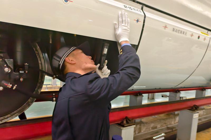 工作人员正在检查动车组车辆。人民网记者梁宏鑫摄