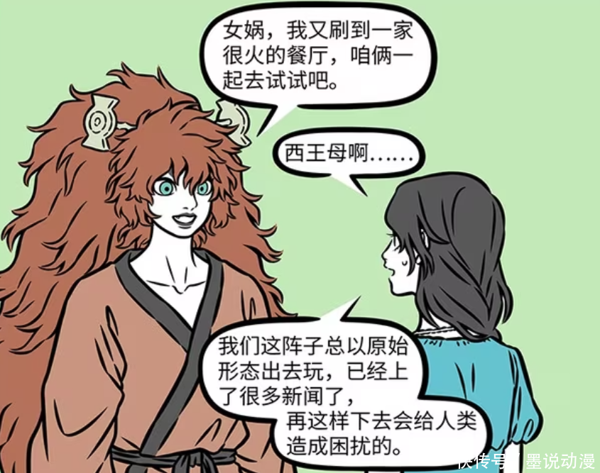 西王母平时只要发现美食,就会来找女娲一起去吃。这一次西王母又找到了一家很火的餐厅,她又来邀请女娲一同前去。女娲可以跟西王母一起去,不过有个前提,她觉得不能总是以原始形态去出去玩,毕竟已经上了好多次新闻。如果再这样下去,会对人类造成困扰。