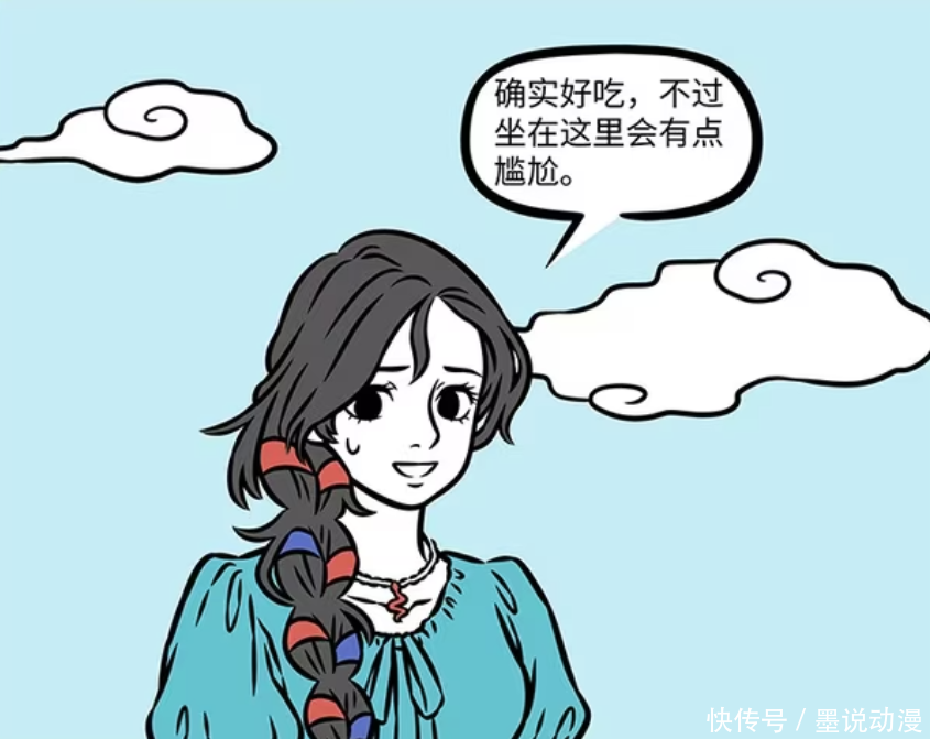 女娲表示很好吃,只是坐在这里会觉得有点尴尬。西王母以真身的模样出现,那女娲肯定也是如此。女娲的真身是人身蛇尾模样,在漫画中也多次画出来过。